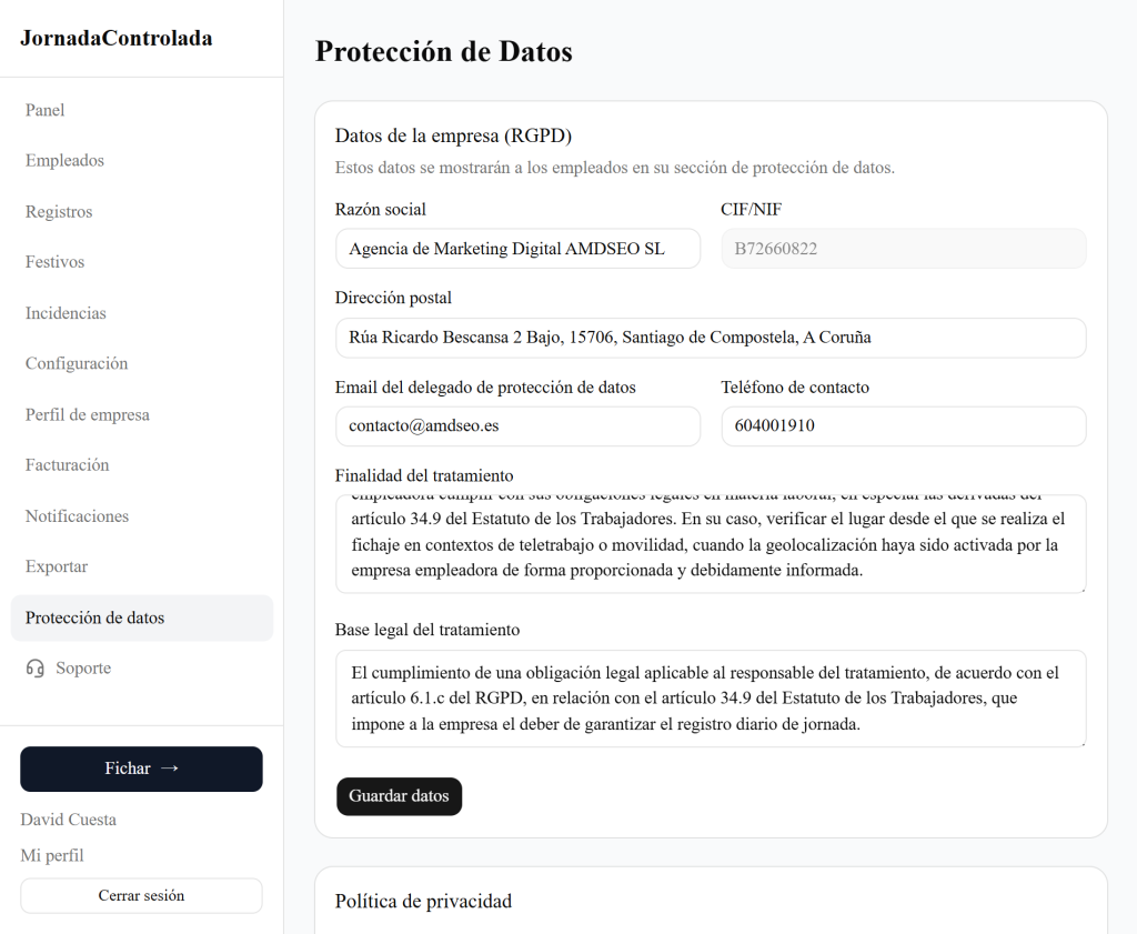 Rellena esta sección de Protección de datos para cumplir con la normativa de privacidad entre tu empresa y tus empleados.