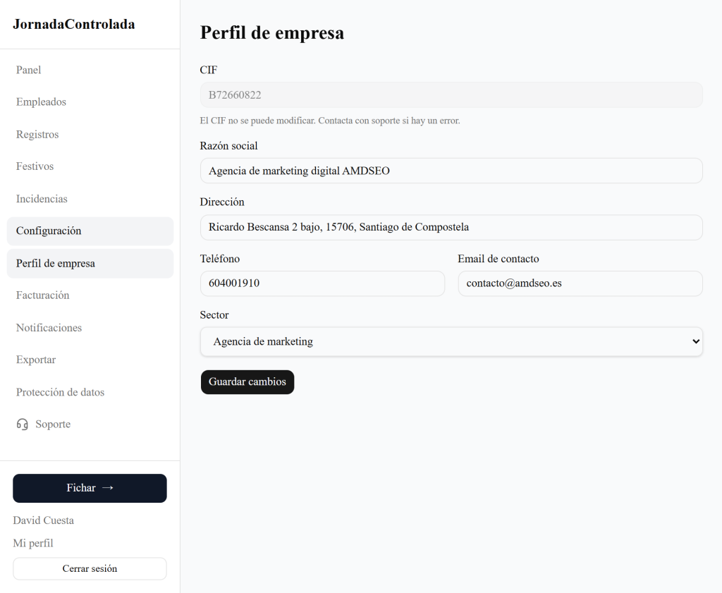 Cuando accedes a JornadaControlada por primera vez, lo haces desde tu perfil de administrador, y tendrás que configurar ahora la información sobre tu empresa, para poder cumplir correctamente con la legislación.