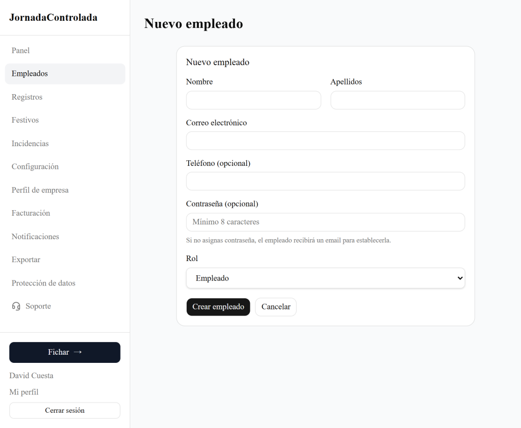 Esta es la pantalla de Nuevo empleado donde deberás rellenar la información de tu empleado. Cuando lo crees, se le enviará un correo electrónico con la contraseña (si la pones) o con un enlace para establecerla.